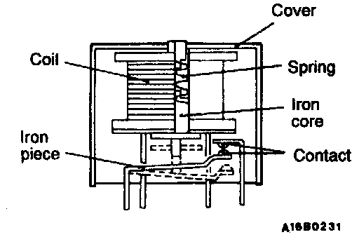 1. When current flows through the coil of a relay, its core is magnetized to attract the iron piece, closing (ON) the contact at the tip of the iron piece. When the coil current is turned off, the iron piece is made to return to its original position by a spring, opening the contact (OFF).
