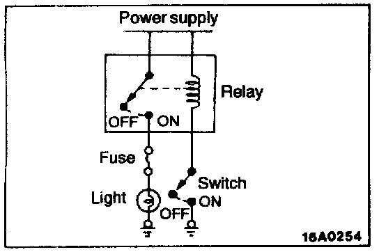 2. By using a relay, a heavy current can be turned on and off by a switch of small capacity. For example, in the circuit shown here, when the switch is turned on (closed), current flows to the coil of the relay. Then, its contact is turned on (closed) and the light comes on. The current flowing at this time to the switch is the relay coil current only and is very small.