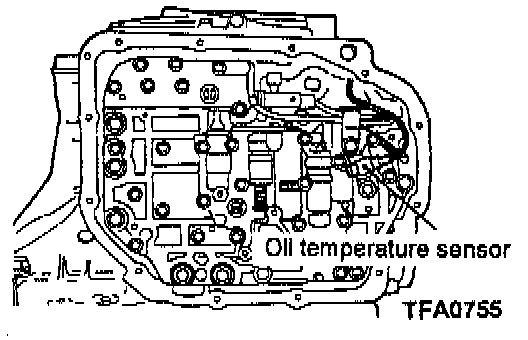 12. Temporarily install the valve body while inserting the detent plate pin in the manual valve groove. Then install the oil temperature sensor and holder and tighten the bolts with the specified torque.