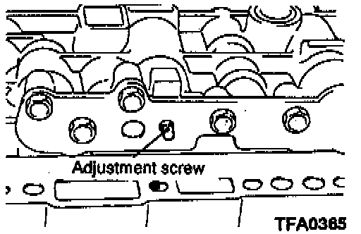 8. Turn the adjustment screw of the regulator valve and adjust so that the line pressure (kickdown brake pressure) becomes the standard value. When the adjustment screw is turned clockwise, the line pressure decreases; when it is turned to counterclockwise it increases.