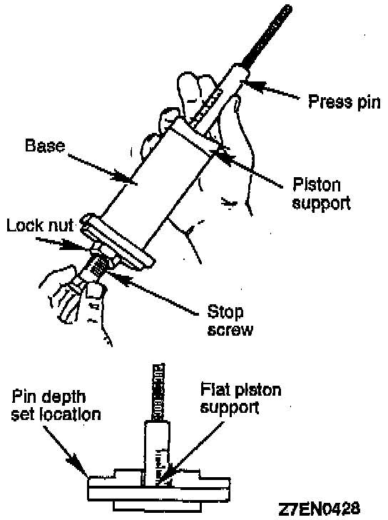 1. Thread the stop screw and lock nut assembly into the base. Fit the correct piston support on top of the base. Insert the press pin, threaded end up, into the hole in the piston support until the press pin touches the stop screw.