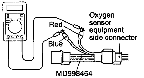 2. Make sure that there is continuity [7-40 Ohm at 20°C (68°F)] between terminal 1 (red clip of special tool) and terminal 3 (blue clip of special tool) on the heated oxygen sensor connector.