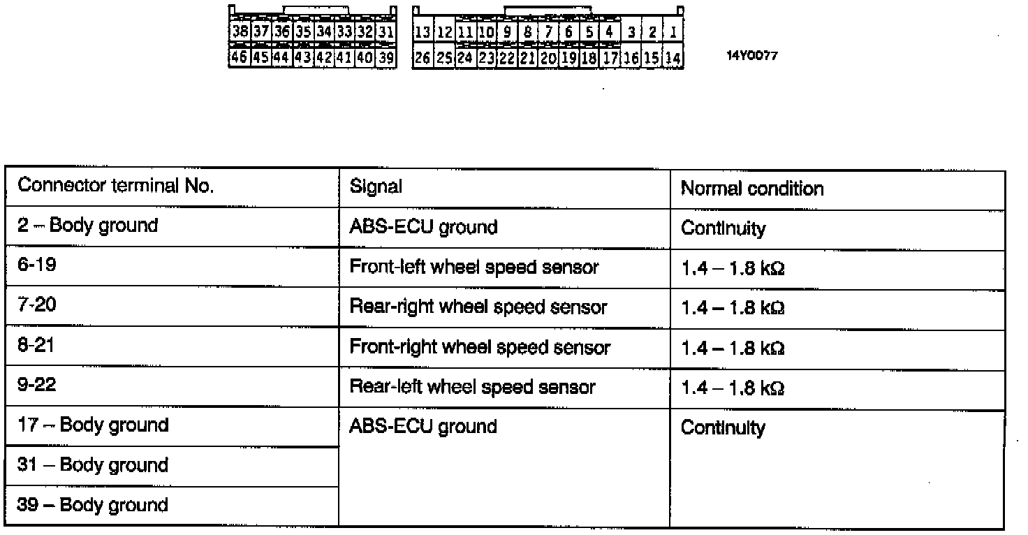 1. Turn the ignition switch "OFF" and disconnect the ABS-ECU connectors before checking resistance and continuity.
