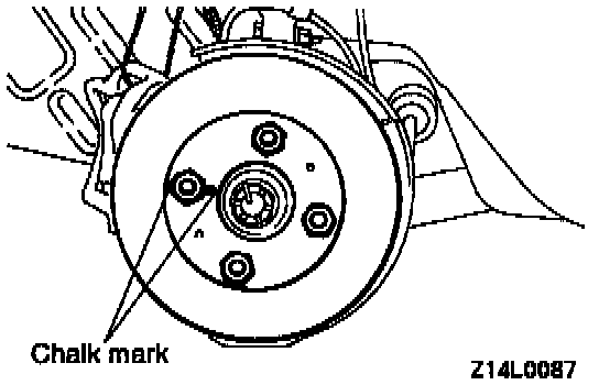 2. Before removing the brake disc, chalk both sides of the wheel stud on the side at which run-out is greatest.