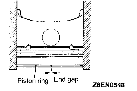 3. Insert the piston ring into the cylinder bore. Force the ring down with a piston, the piston crown being in contact with the ring, to correctly position it at right angles to the cylinder wall. Then, measure the end gap with a feeler gauge. If the ring gap is excessive, replace the piston ring.