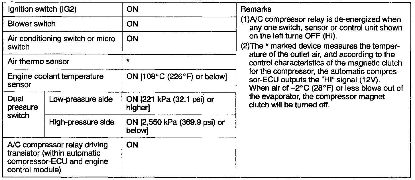 - The dual pressure switch turns OFF when the refrigerant pressure becomes excessively high A/C Compressor Relay ON Conditions or low, thus protecting the compressor circuit. (See Table below.)