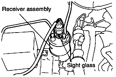 The sight glass is a refrigerant level indicator. To check the refrigerant level, clean the sight glass and start the vehicle engine. Push the A/C button to operate the compressor, place the blower switch to high and move the temperature control lever to max cool. After operating for a few minutes in this manner, check the sight glass.