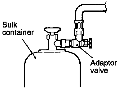 16. Turn the handle of the adaptor valve back all the way (valve closed), remove it from the gauge manifold and install the bulk container.