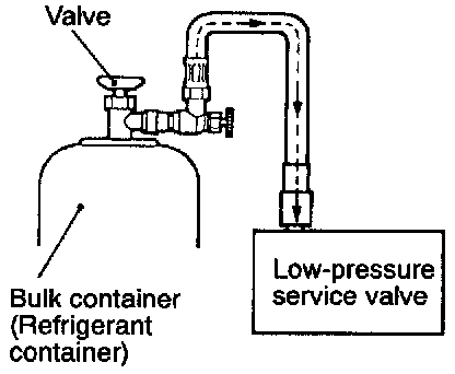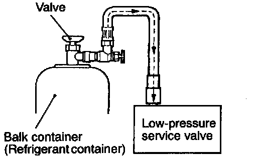 CAUTION: If the bulk container can is Inverted, liquid refrigerant may be drawn Into the compressor damaging It by hydraulic lock. Keep the bulk container upright to ensure that refrigerant is charged in gas state.
