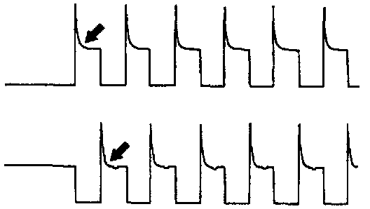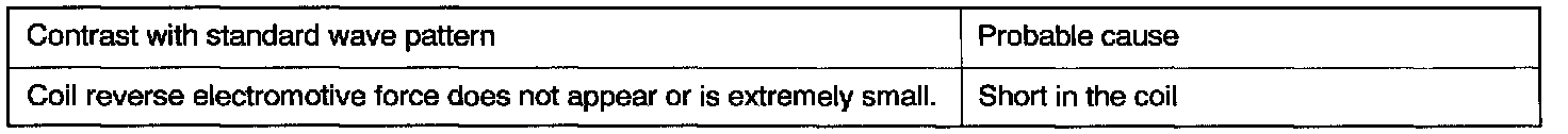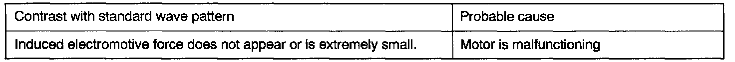 Current is not supplied to the motor coil on the open circuit side. (Voltage does not drop to 0 V.) Furthermore, the induced electromotive force waveform at the normal side is slightly different from the normal waveform.