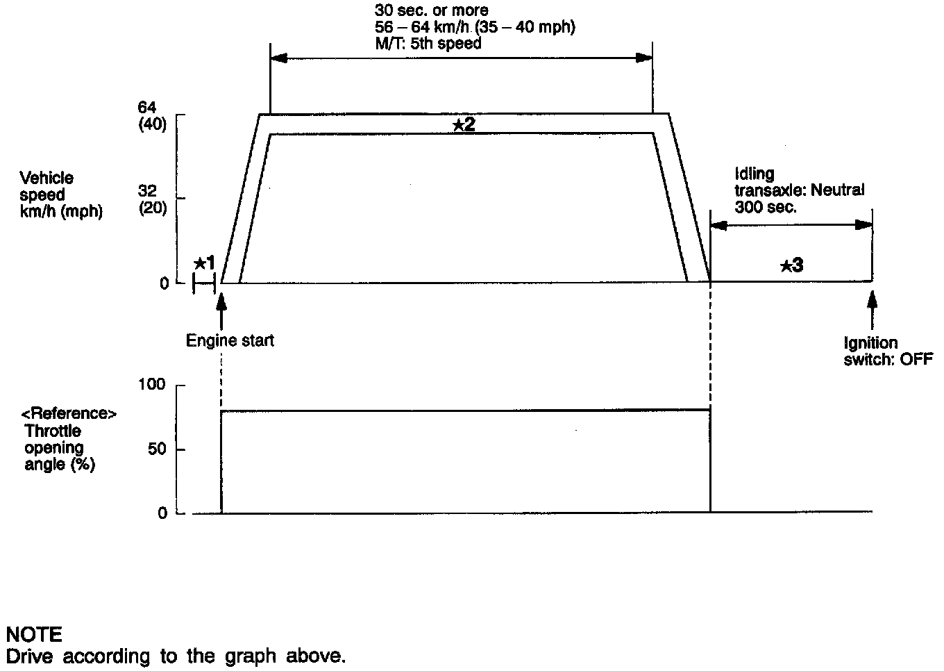 *2: Start the engine, accelerate to 56 - 64 km/h (35 - 40 mph), continue driving for 300 seconds or more at that speed range and stop. Moreover, brake or throttle may be applied for this period.