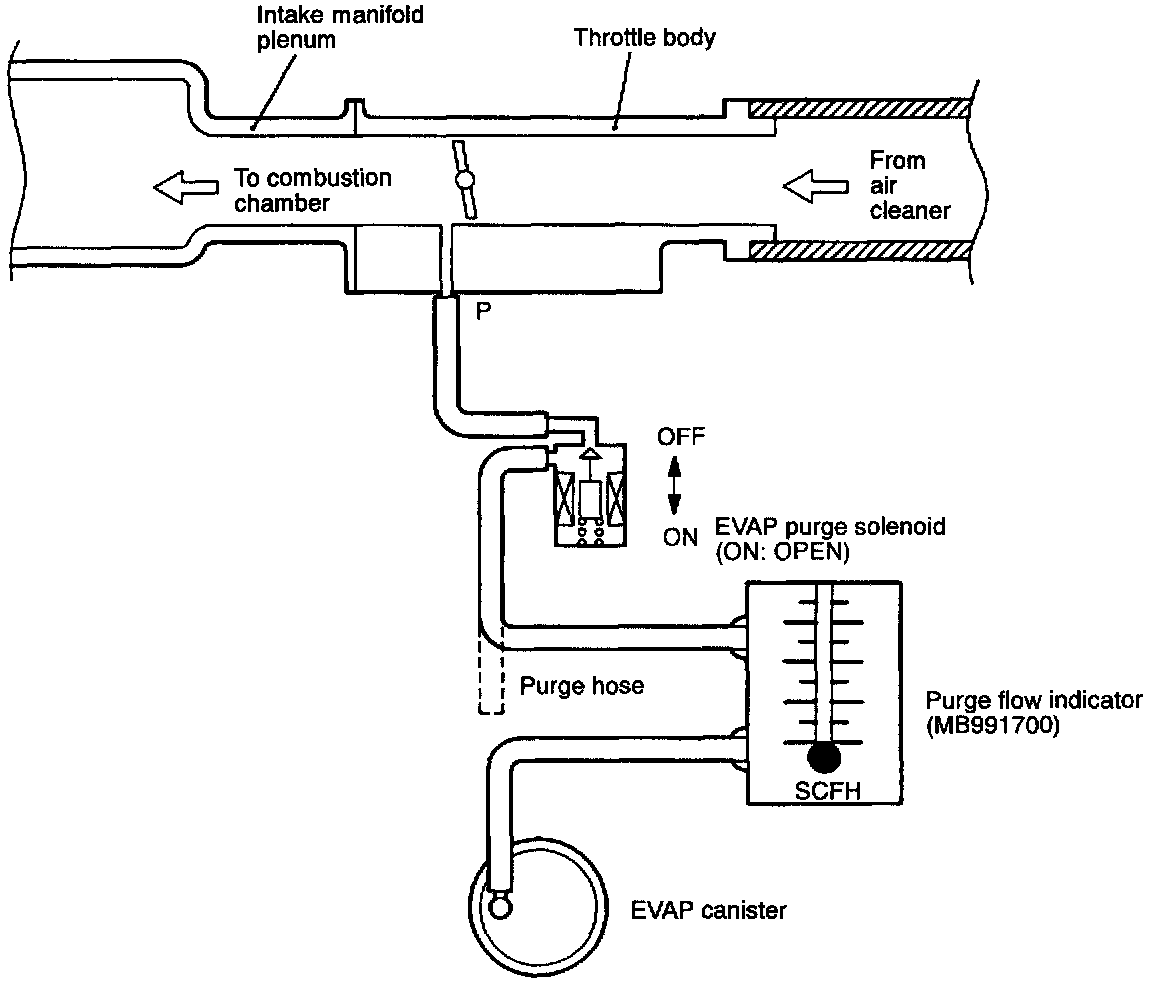 7. If both values at steps 4 and 5 are less than the standard value, check the evaporative emission purge solenoid, vacuum port and vacuum hose for clogging.