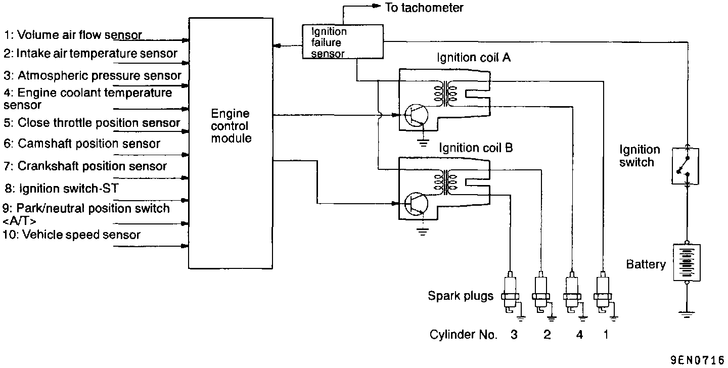This system is provided with two ignition coils (A and B) with built-in ignition power transistors for the No. 1 and No. 4 cylinders and No. 2 and No. 3 cylinders respectively.