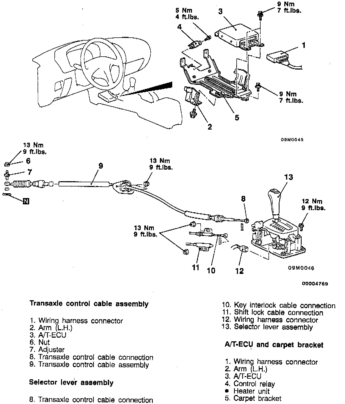 CAUTION: Supplemental Restraint System (SRS): Be careful not to subject the Air Bag Control Unit (SRS-ECU) to any shocks during removal and installation of the transaxle control cable, key interlock cable, shift lock cable and selector lever assembly.