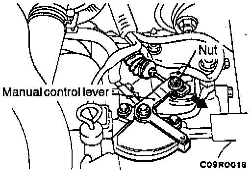 2. Loosen the adjusting nut, gently pull the transaxle control cable in the direction of the arrow and tighten the nut.