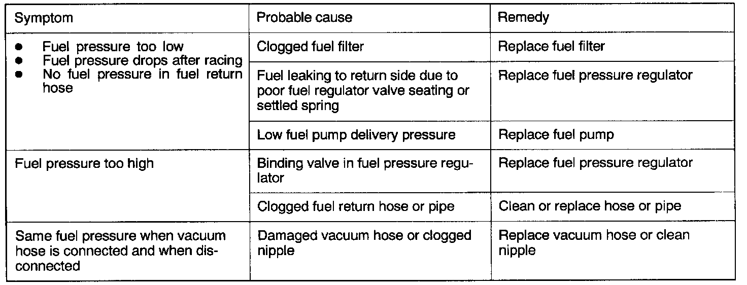 13. If any of fuel pressure measured in steps 9 to 12 is out of specification, troubleshoot and repair according to the table below.