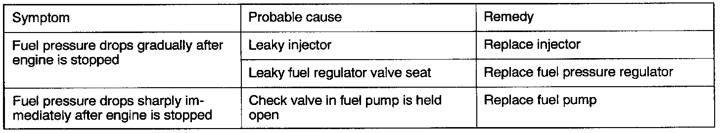 14. Stop the engine and observe fuel pressure gauge reading. Normal if the reading does not drop within 2 minutes. If it does, observe the rate of drop and troubleshoot and repair according to the table below.