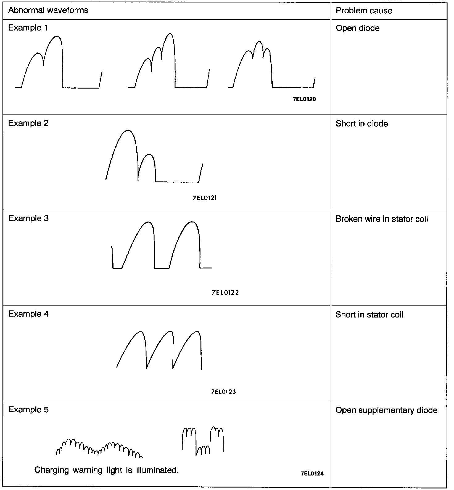 2. Identification of abnormal wave-forms is easier when there is a large output current (regulator is not operating). (Wave-forms can be observed when the headlights are illuminated.)