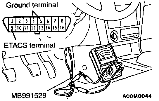 1. Use the special tool to connect a voltmeter between the ground terminal and the ETACS terminal of data link connector.