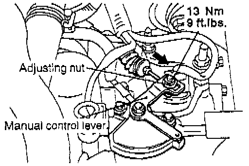 1. Set the selector lever to the "N" position.2. Loosen the control cable to manual control lever coupling nut to free the cable and lever.