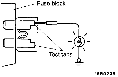 A blade type fuse has test taps provided to allow checking of the fuse itself without removing it from the fuse block. The fuse is okay if the test light comes on when its one lead is connected to the test taps (one at a time) and the other lead is grounded. (Change the ignition switch position adequately so that the fuse circuit becomes live.)