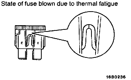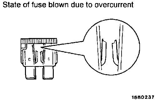 The illustration shows the state of a fuse blown due to this cause. In this case, do not replace the fuse with a new one hastily since a current heavy enough to blow the fuse has flowed through it. First, check the circuit for shorting and check for abnormal electric parts. Only after the correction of such shorting or parts, fuse of the same capacity should be used as a replacement. Never use a fuse of larger capacity than the one that has blown. If such a fuse is used, electric parts or wirings could be damaged before the fuse blows in the event an overcurrent occurs again.