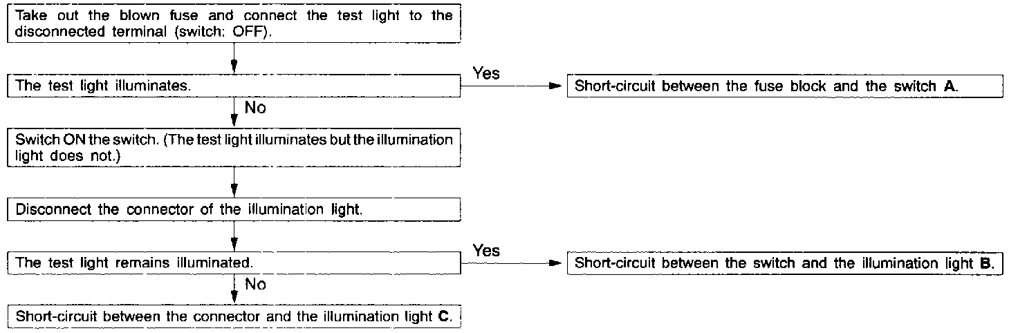 Because the fuse has blown. It is probable that there is a short-circuited circuit. Follow the procedures above to narrow down the short-circuit location.