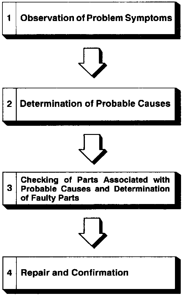 If an attempt is made to solve a problem without going through correct steps for troubleshooting, the problem symptoms could become more complicated, resulting in failure to determine the causes correctly and making incorrect repairs. The four steps below should be followed in troubleshooting.
