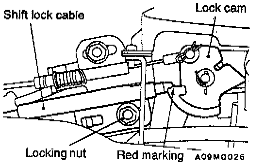 d. Tighten the locking nut so that the end of the shift lock cable comes above the red marking of the lock cam.
