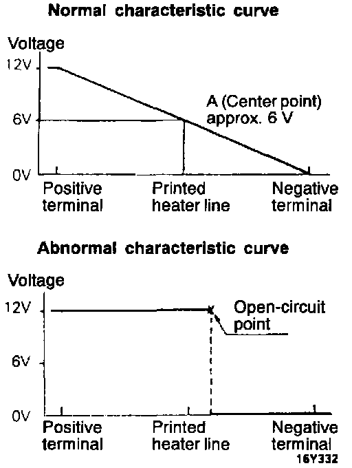 2. Turn ON rear window defogger switch. Measure heater element voltage with circuit tester at rear window glass center A.