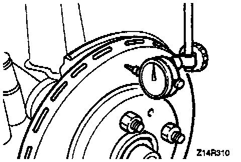 3. Place a dial gauge approximately 5 mm (0.2 inch) from the outer circumference of the brake disc, and measure the run-out of the disc.