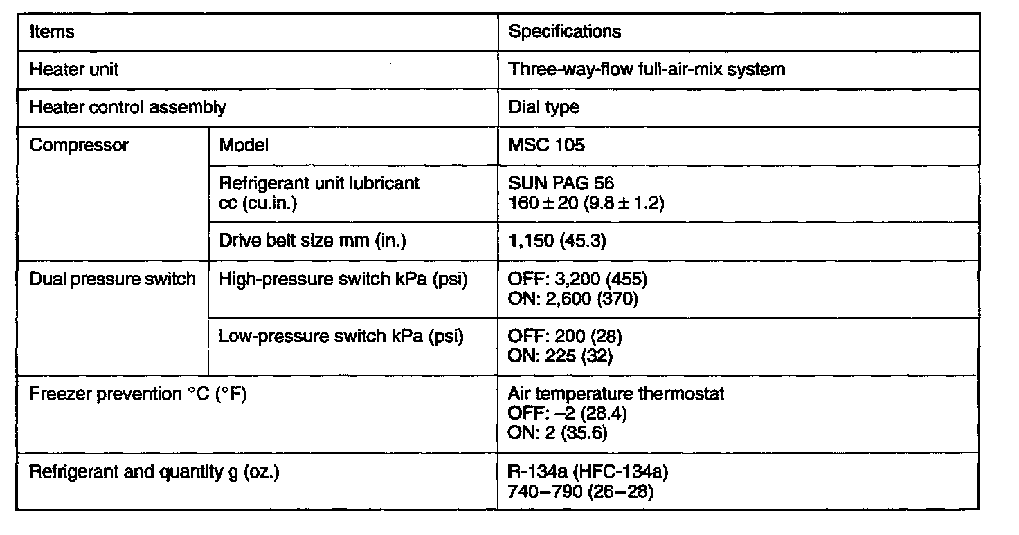 The A/C system is basically the same as the conventional system, but a new refrigerant system has been adopted as a response to restrictions on the use of chlorofluorocarbons.