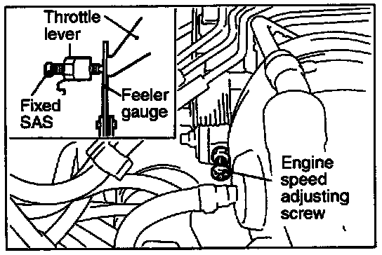 (2) Insert a 0.65 mm (0.025 in.) thick feeler gauge between the fixed SAS and throttle lever.