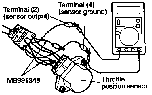 b. Connect a digital voltmeter between the throttle position sensor terminal (2). (sensor output) and terminal (4) (sensor ground).