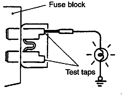 A blade type fuse has test taps provided to allow checking of the fuse itself without removing it from the fuse block. The fuse is okay if the test light comes on when its one lead is connected to the test taps (one at a time) and the other lead is grounded. (Change the ignition switch position so that the fuse circuit becomes live.)