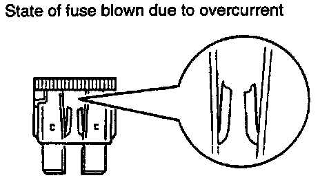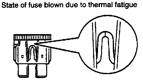 The illustration shows the state of a fuse blown due to this cause. In this case, do not replace the fuse with a new one hastily since a current heavy enough to blow the fuse has flowed through it. First, check the circuit for shorting and check for abnormal electric parts. After correcting shorts or replacing parts, the use only a fuse of the same capacity as a replacement. Never use a fuse of larger capacity than the one that has blown. If such a fuse is used, electric parts or wirings could be damaged before the fuse blows in the event an overcurrent occurs again.