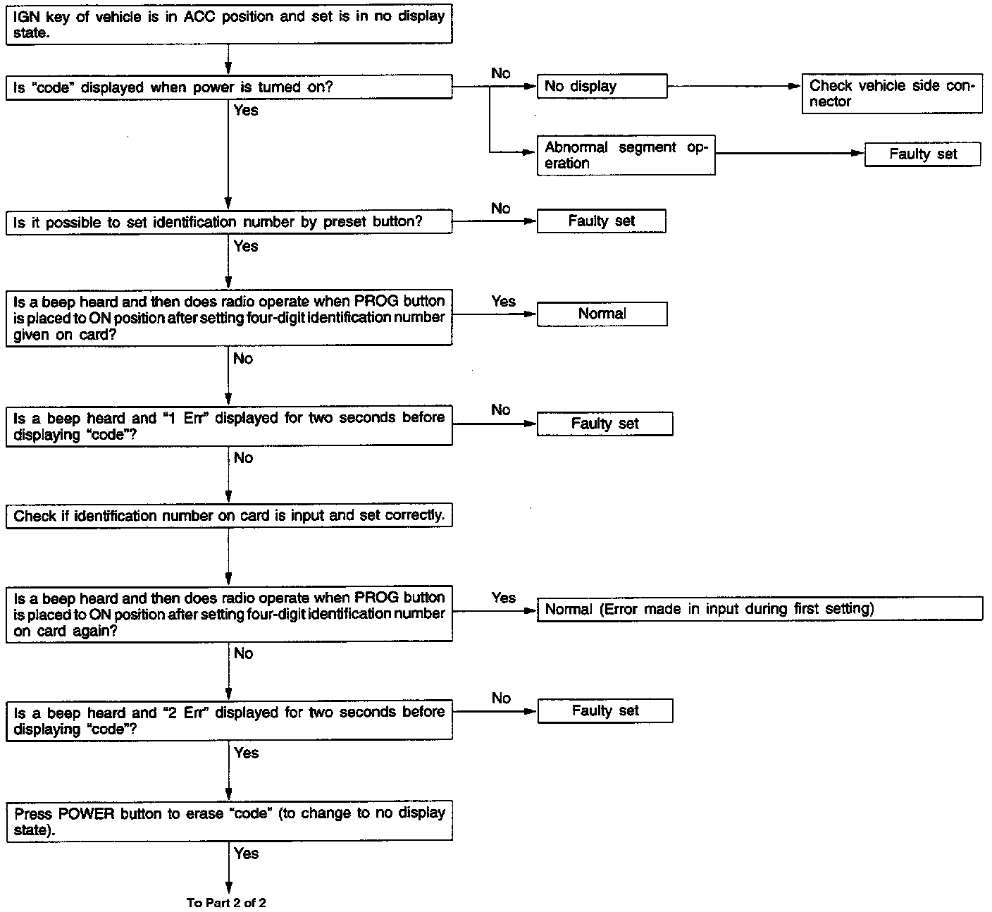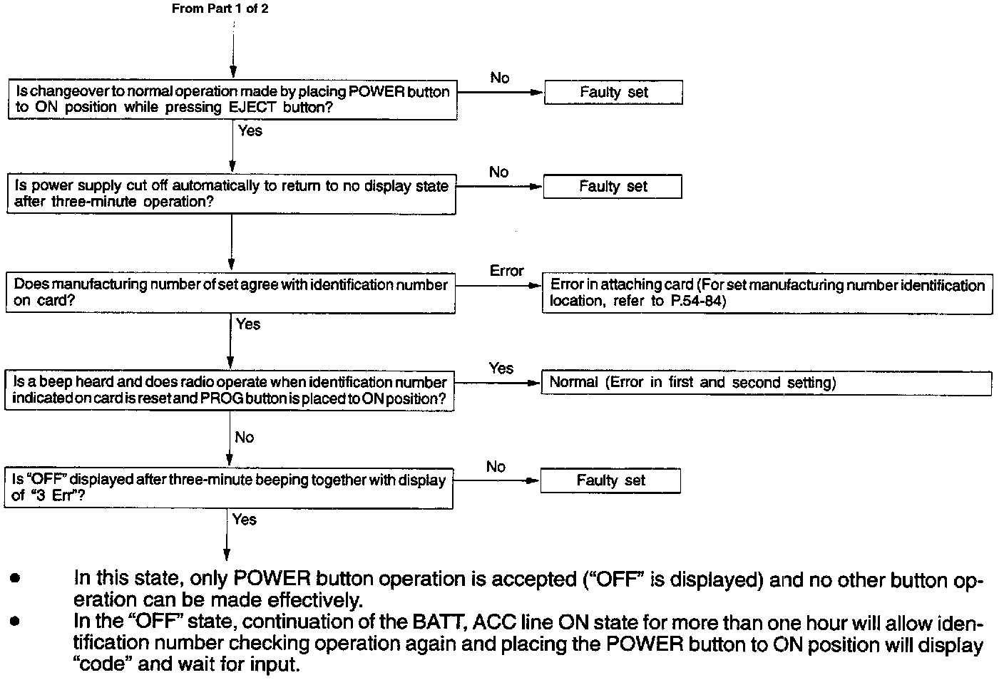 - In the "OFF" state, continuation of the BATT. ACC line ON state for more than one hour will allow identification number checking operation again and placing the POWER button to ON position will display "code" and wait for input.