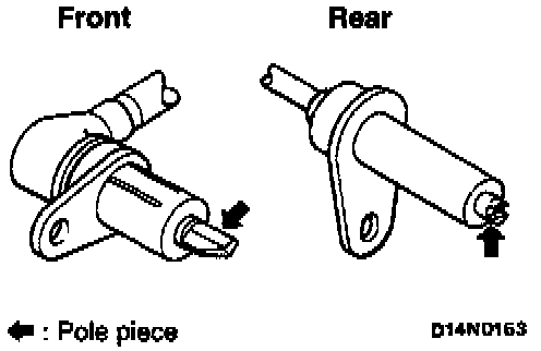 CAUTION: The speed sensor pole piece is magnetized by a bulletin magnet inside the sensor, so it tends to attract metal. If the pole piece is damaged, accurate wheel speed detection may not be expected.