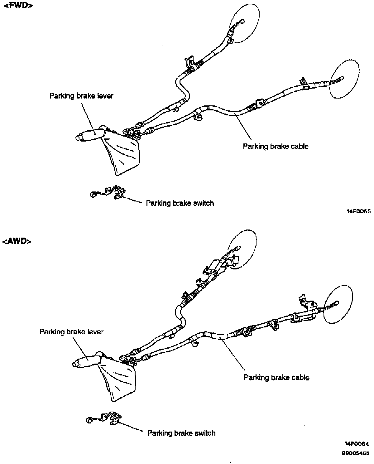 The parking brake cable is of the V-type and is accessible for adjustment through the service hole provided in me floor console.