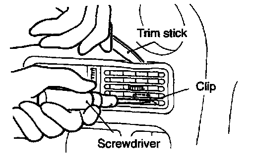 Disengaging the clips (2 positions) of the center air outlet assembly with a flat tip screwdriver, remove the center air outlet assembly with the trim stick.