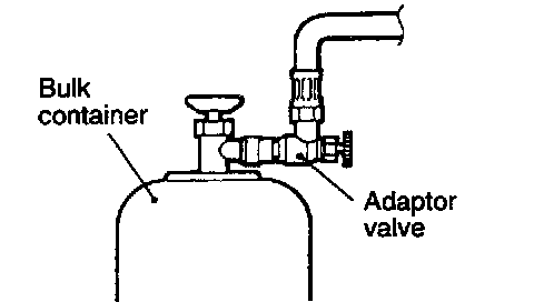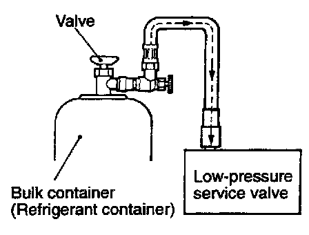 CAUTION: If the bulk container is inverted, liquid refrigerant may be drawn into the compressor damaging it by hydraulic lock. Keep the bulk container upright to ensure that refrigerant is charged in gas state.