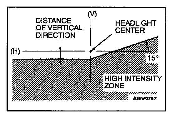 1. A properly aimed lower beam will appear on the aiming screen 3m (9.8 feet) in front of the vehicle. The shaded area as shown in the illustration indicates high intensity zone.