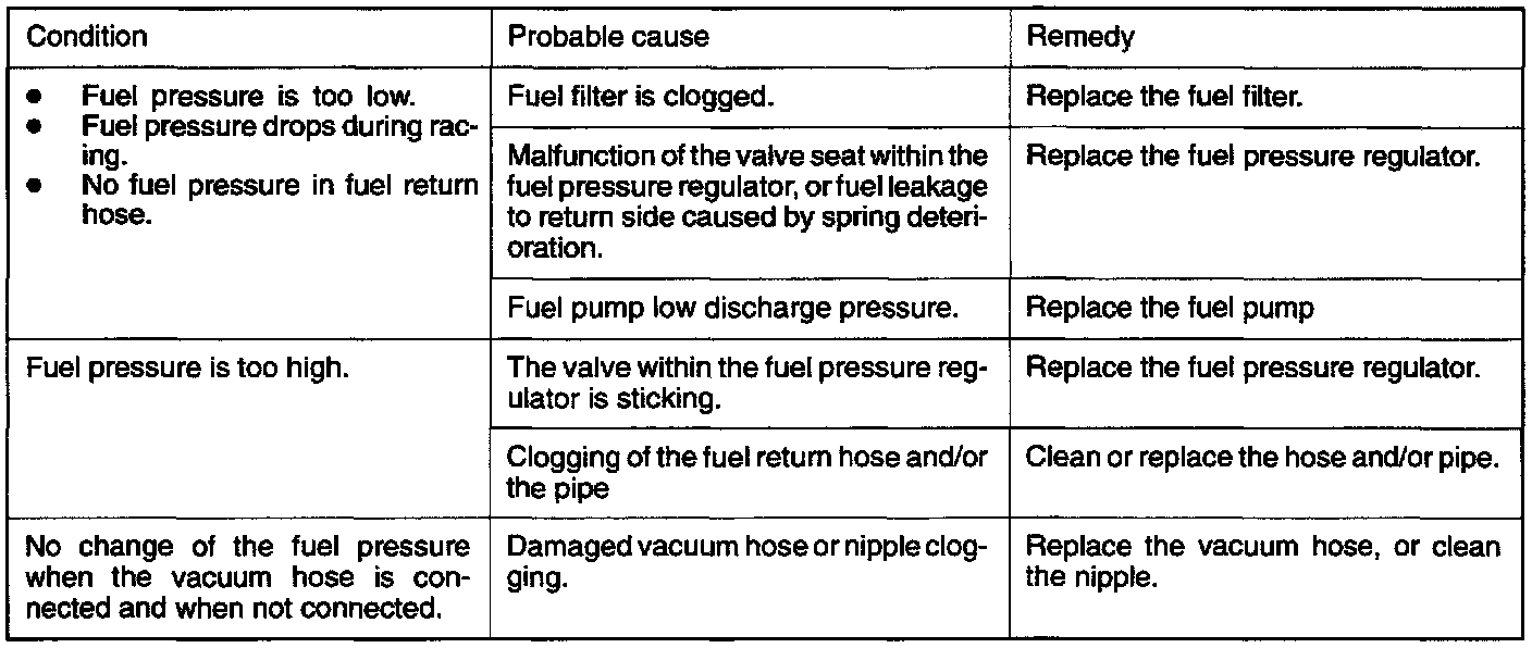 (12) If the fuel pressure measured in steps (8) to (11) deviates from the standard value range, check for the probable cause by referring to the table above and then make the appropriate repair.