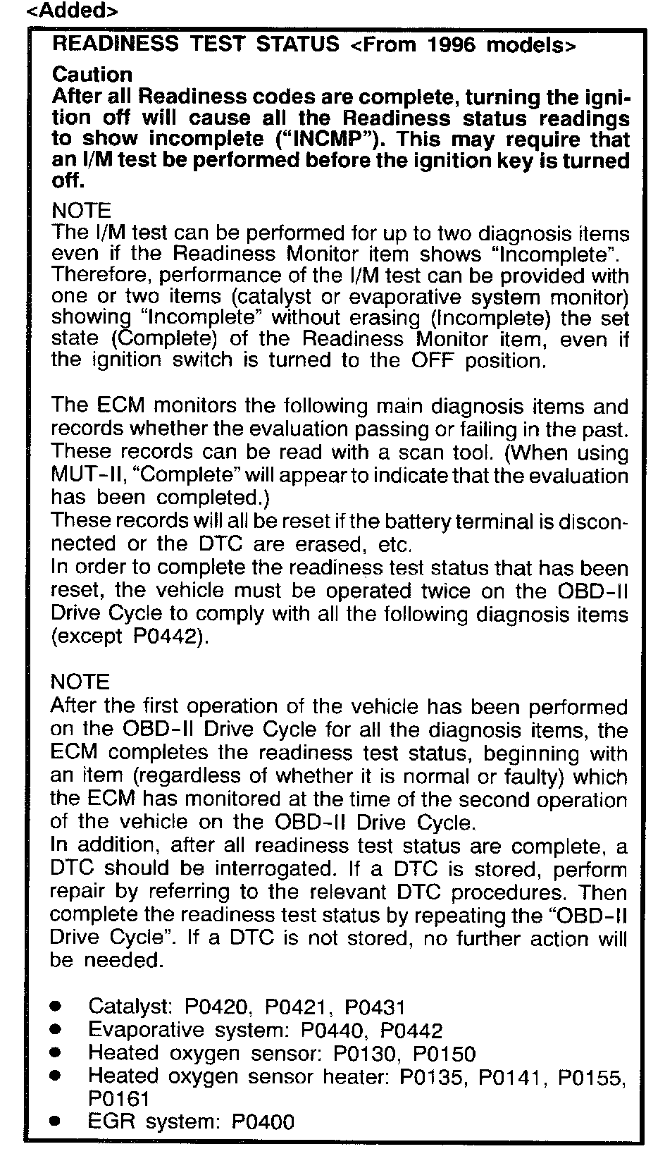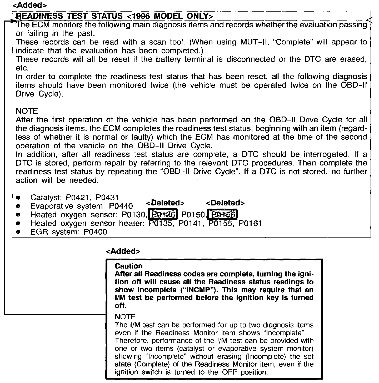 1996 3000GT Volume 1, Page 13A-50; 1997 3000GT Volume 1, Page 13A-42; 1996 Montero, Volume 1, Page 13A-37; 1997 Montero, Volume 1, page 13A-42 Add the page shown after step (3) of the CAUTION statement in the READ OUT OF DIAGNOSTIC TROUBLE CODE (3000GT) or READING OF DIAGNOSTIC TROUBLE CODES (Montero) section on each of the above listed pages.