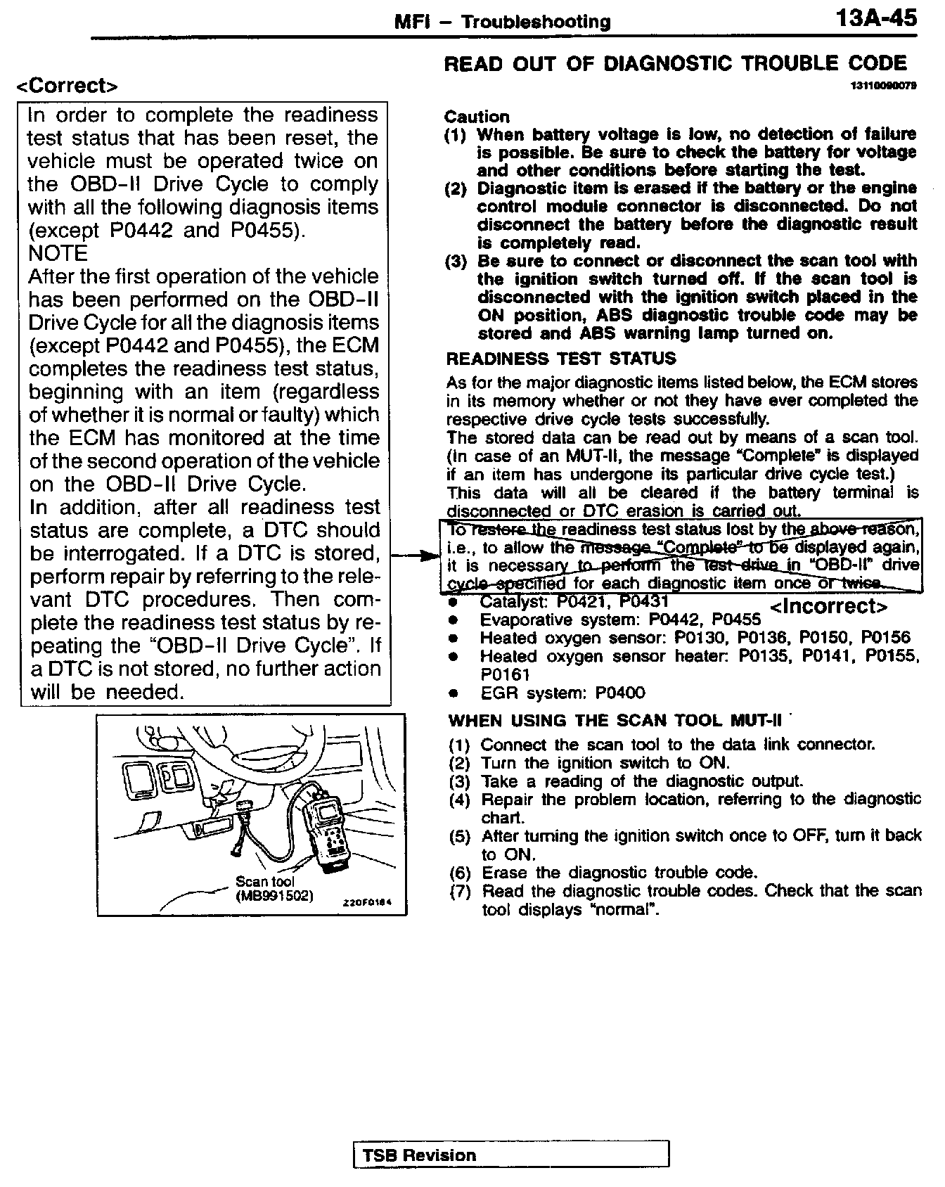 1998 3000GT Volume 1 Page 13A-45 Correct the Readiness Test Status statement as shown.