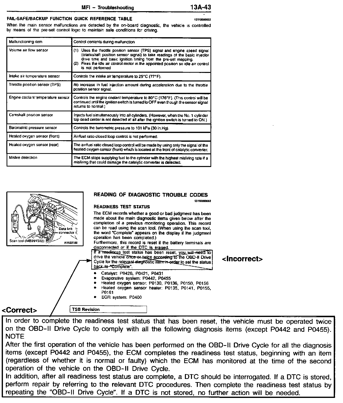 1998 Montero, Volume 1, Page 13A-43 Correct the Readiness Test Status statement as shown.