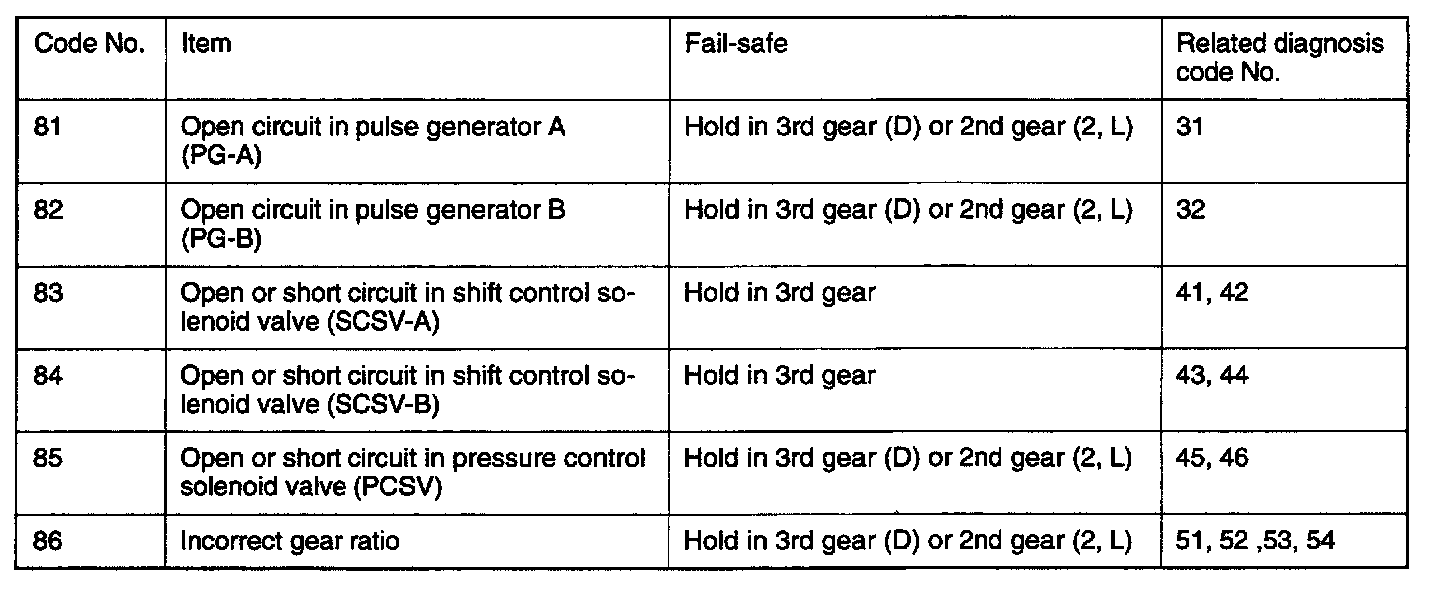 In addition, fail-safe codes lock the transaxle in 3rd or 2nd gear. Fail-safe will be canceled if the ignition switch is turned to OFF. The diagnostic trouble codes will remain.