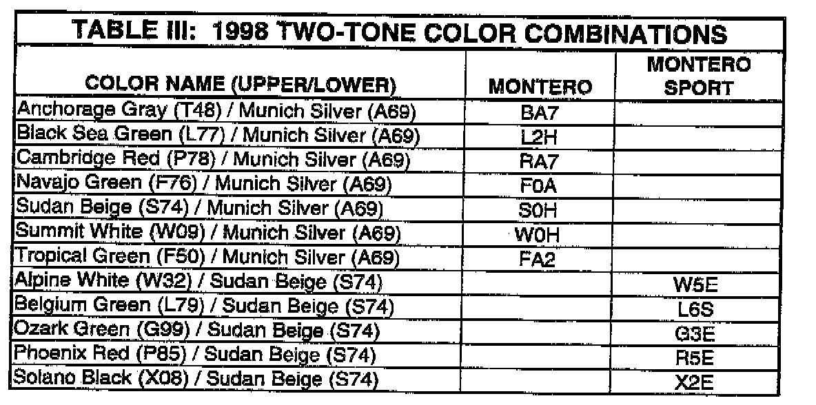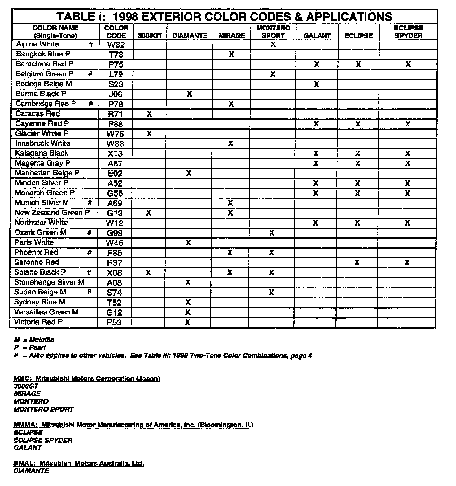 This bulletin contains complete exterior color information on all 1998 Mitsubishi Motors vehicles.