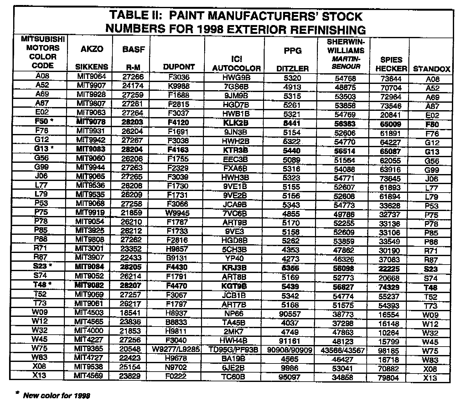 Table II contains the manufacturers' stock numbers from several automotive refinish companies, which correspond with the Color Codes and Applications shown in Table I. The new colors for 1998 are identified by an asterisk (*)