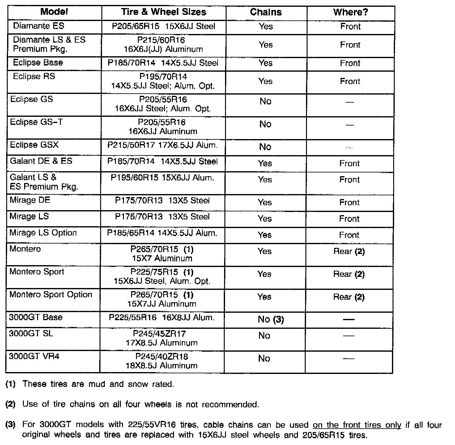 ^ Tire chains cannot be used on any 3000GT with factory-equipment wheels and tires. However, on base 3000GT models, if all four original wheels and tires are replaced with 15X6JJ steel wheels and 205/65R15 tires, chains may be used only on the front wheels.